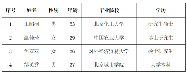 为广泛接受社会监督,确保引进毕业生工作信息公开、过程公开、结果公开,在向社会公开发布招聘信息的基础上,经报名、考核、资格审查、面试笔试等环节,确定了我单位2025年拟引进非北京生源毕业生名单,现予以公示: